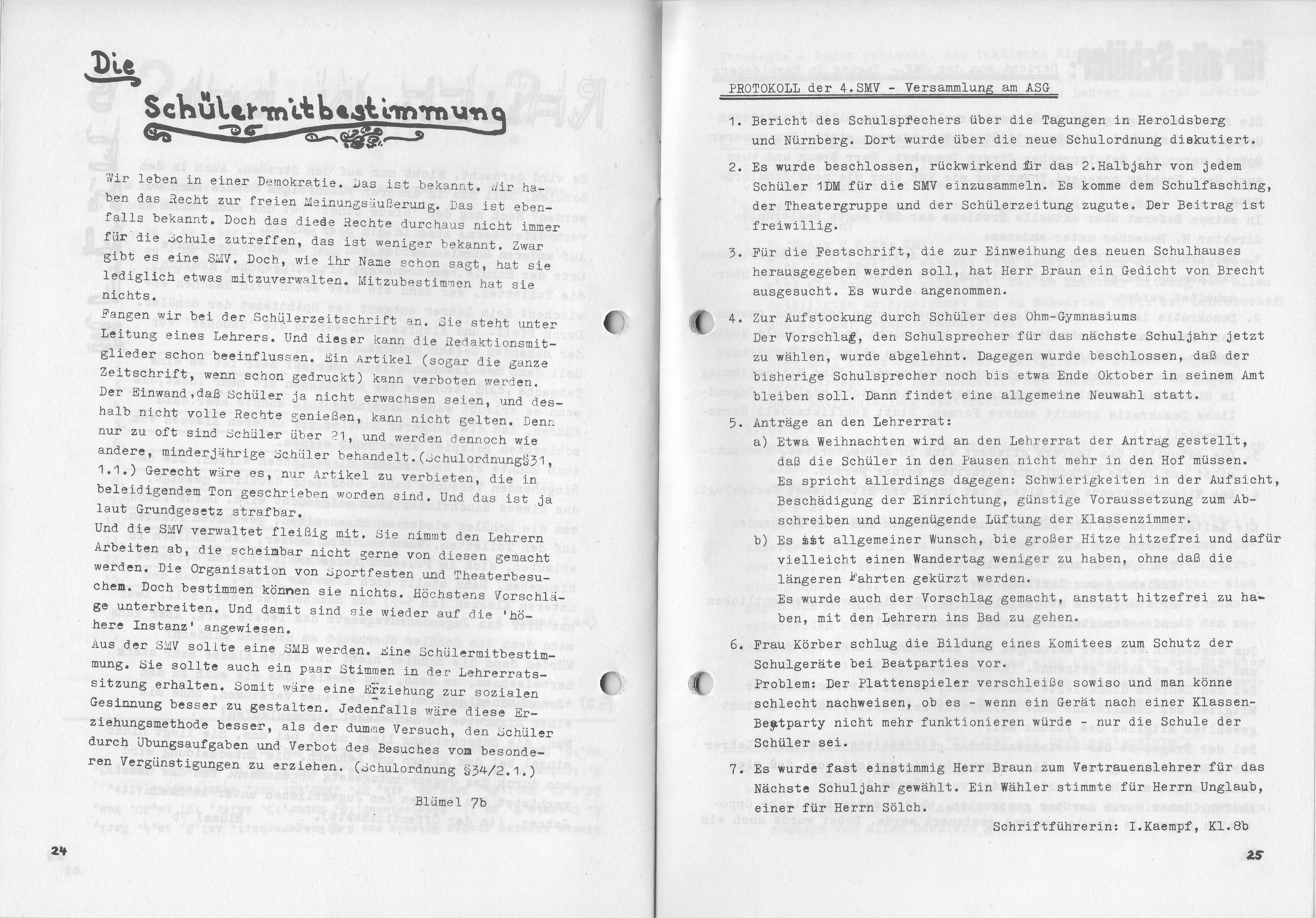 Im Schuljahr 1967/68 zeigte sich, dass die Politisierung der Gesellschaft der Bundesrepublik – genannt seien hier als Schlagworte nur die Anti-Vietnamkriegs-Demonstrationen, die Diskussion um die Notstandsgesetze, die Studentenrevolte und die Forderung nach mehr Demokratie – auch auf die Schulen ausstrahlte. Die innerschulische Diskussion bestimmten in den nächsten Jahren unter dem Stichwort „Erziehung zur Demokratie“ die Bemühungen um die Erweiterung der Mitwirkungsmöglichkeiten der Eltern, die Entwicklung besserer Beziehungen zwischen Lehrern, Schülern und Eltern sowie die Forderung nach der Pressefreiheit für die Schülerzeitung und eine zeitgemäße Sexualaufklärung .