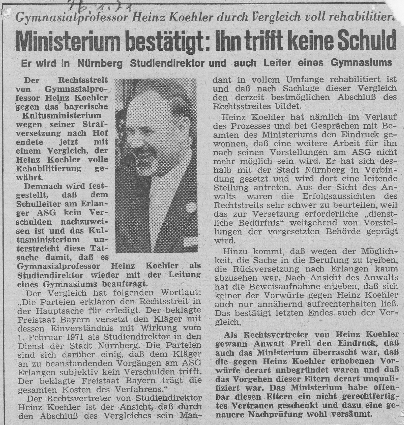So berichtete das Erlanger Tagblatt in der Ausgabe vom 16./17.01.1971 unter der Überschrift „Ministerium bestätigt: Ihn trifft keine Schuld“, der Anwalt Koehlers sei der Ansicht, „ daß durch den Abschluß des Vergleiches sein Mandant in vollem Umfang rehabilitiert ist und daß nach Sachlage dieser Vergleich den derzeit bestmöglichen Abschluß des Rechtsstreits bildet.“ Der Anwalt verwies ferner darauf, dass sich „keiner der Vorwürfe gegen Heinz Koehler auch nur annähernd aufrechterhalten ließ“ und dass das Ministerium „diesen Eltern ein nicht gerechtfertigtes Vertrauen geschenkt und dazu eine genauere Nachprüfung wohl versäumt“ habe.