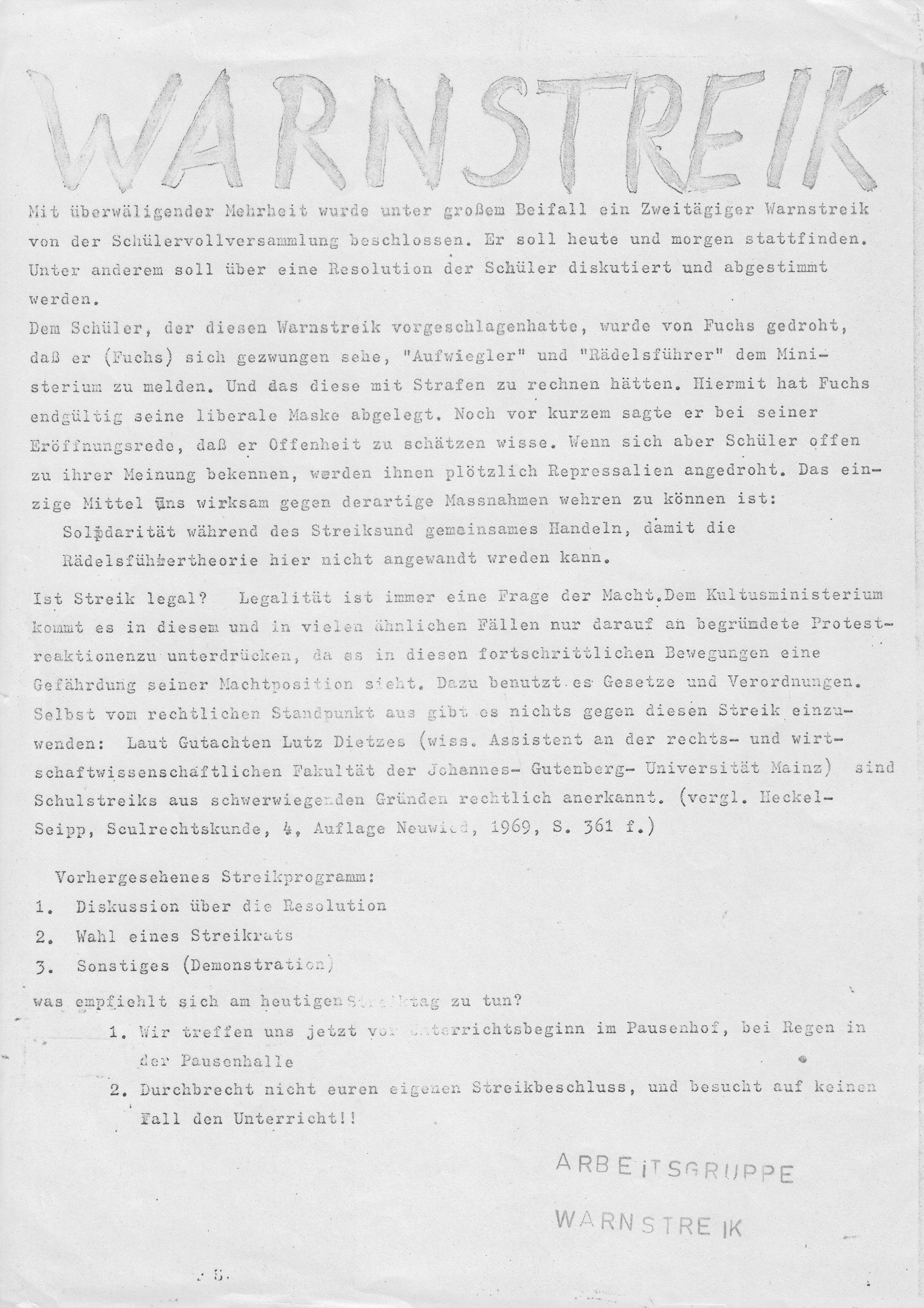 Dagegen verlief am Nachmittag des 15. 09.1970 eine „Pro-Koehler-Demonstration, zu der die Aktionsgemeinschaft Schulstreik am ASG aufgerufen hatte“ und an der etwa 400 Schüler teilgenommen hatten, ohne Zwischenfälle.