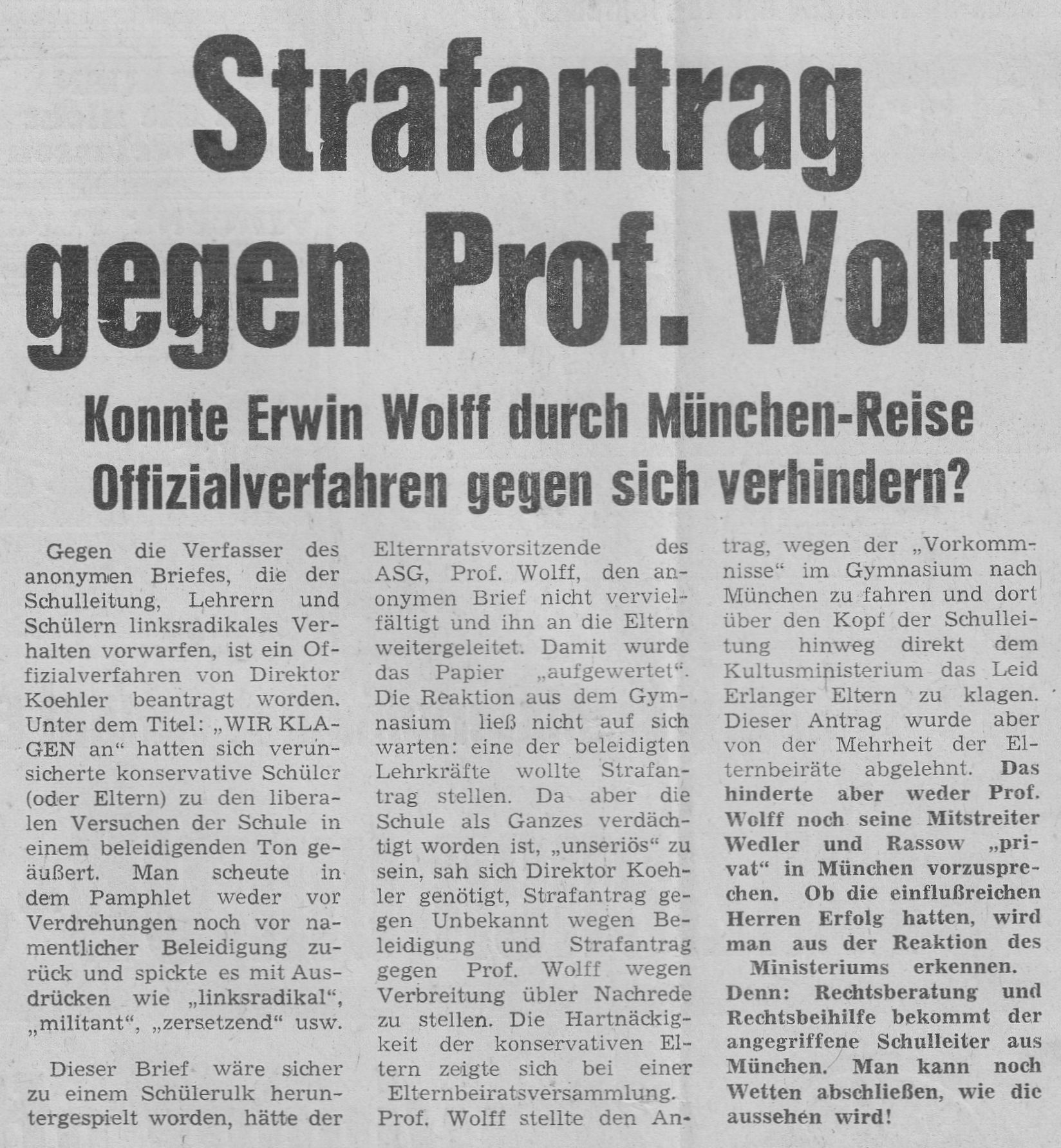 Die Öffentlichkeit in Erlangen erfuhr durch einen Artikel, erschienen im Erlanger Tagblatt vom 05./06.09.1970 unter der Überschrift „Direktor Koehler muss Erlangen verlassen“, von der am 24.08.1970 ausgesprochenen Amtsenthebung des Schulleiters und seiner Versetzung nach Hof, die am 01.09. in Kraft getreten waren. Viele Schüler, Eltern und Lehrer waren von dieser Maßnahme überrascht worden und zutiefst betroffen.